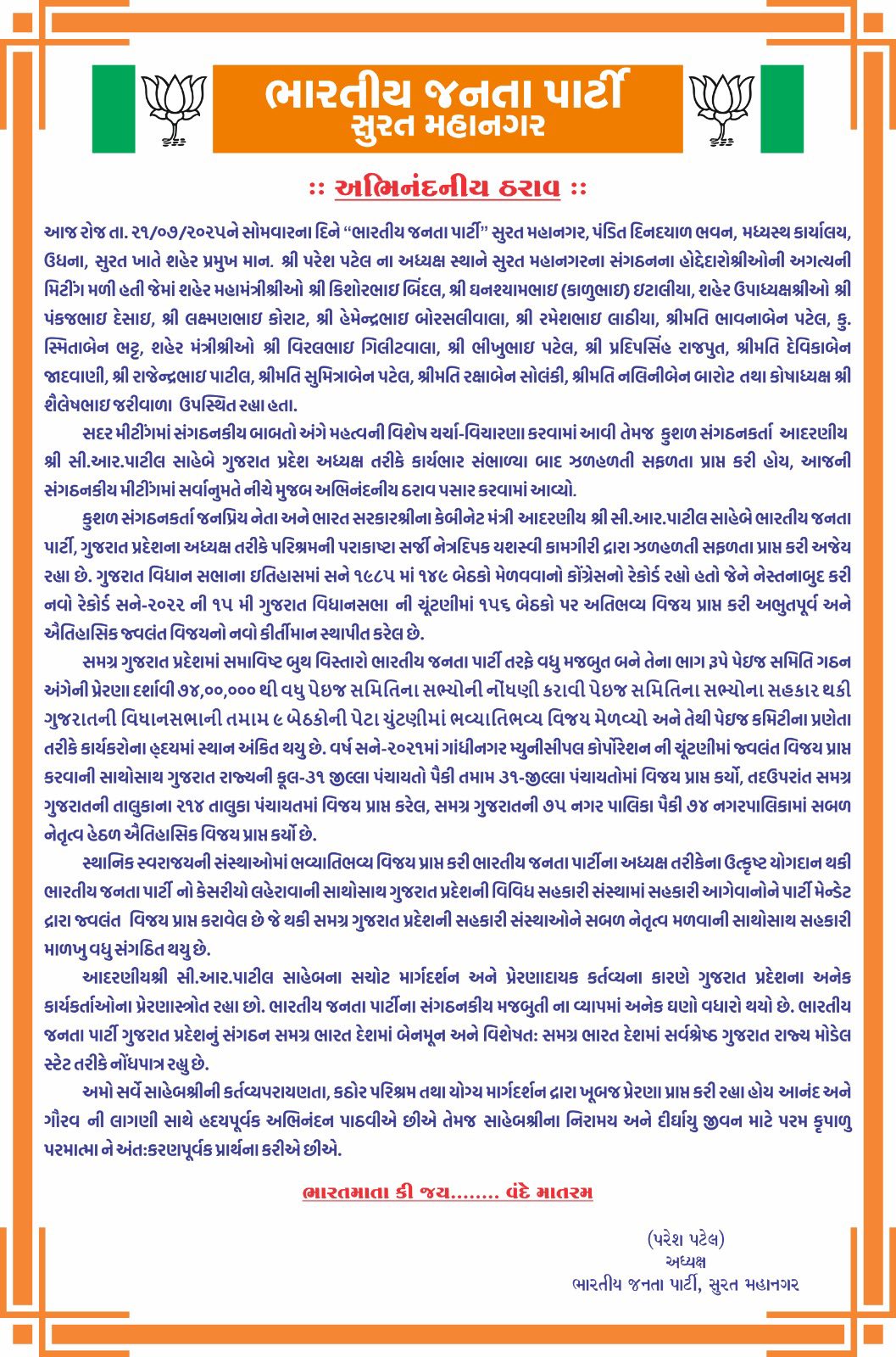 કાર્યકર્તાશ્રીઓ એમનાં કર્મ, મૂલ્યો અને ભારતીય જનતા પાર્ટીનાં સંસ્કાર દ્વારા સંગઠનને મજબૂત બનાવે છે-મારા કાર્યકર્તાશ્રીઓ મારી ઉર્જા છે, મારી તાકાત છે. અપાર સ્નેહ અને સહકાર બદલ સુરત શહેર સંગઠનનાં સૌ કાર્યકર્તાશ્રીઓનો હૃદયપૂર્વક આભાર માનું છું અને સૌને સેવા પખવાડિયાને સફળ બનાવવા આહવાન કરું છું.