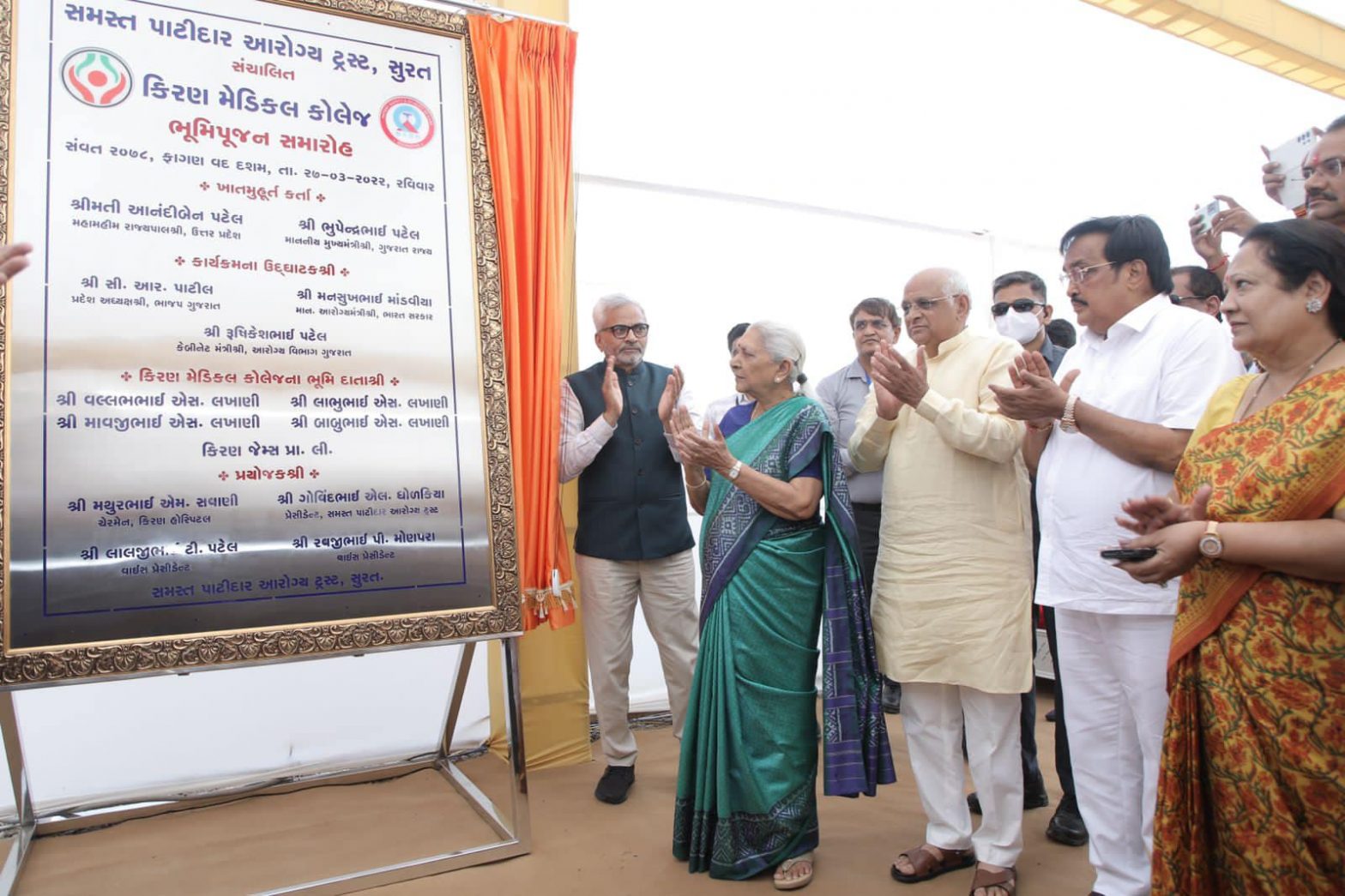 ઉત્તર પ્રદેશનાં મહામહિમ રાજ્યપાલશ્રી આનંદીબેન પટેલ, ગુજરાતનાં મુખ્યમંત્રી માનનીય શ્રી ભૂપેન્દ્રભાઇ પટેલનાં શુભહસ્તે અને કેન્દ્રીય આરોગ્યમંત્રી શ્રી મનસુખભાઇ માંડવિયાજીની વિશેષ ઉપસ્થિતિમાં સુરત ખાતે સમસ્ત પાટીદાર આરોગ્ય ટ્રસ્ટ સંચાલિત કિરણ મેડિકલ કોલેજનું ભૂમિપૂજન કરાયું. આ પ્રસંગે હાજરી આપી. આ પ્રસંગે કેન્દ્રીય રાજ્યમંત્રી શ્રીમતી દર્શનાબેન જરદોશ, કેબિનેટ મંત્રી શ્રી ઋષિકેશભાઈ પટેલ, શ્રી પૂર્ણેશભાઈ મોદી, શ્રી જીતુભાઈ વાઘાણી, ગૃહ રાજ્યમંત્રી શ્રી હર્ષભાઈ સંઘવી, રાજ્યકક્ષાના મંત્રી શ્રી વિનોદભાઈ મોરડીયા, શ્રી મુકેશભાઈ પટેલ, ધારાસભ્યશ્રીઓ, મેયર શ્રીમતી હેમાલીબેન બોઘાવાલા સહિત પદાધિકારીશ્રીઓ, આગેવાનો અને મોટી સંખ્યામાં નગરજનો ઉપસ્થિત રહ્યાં.