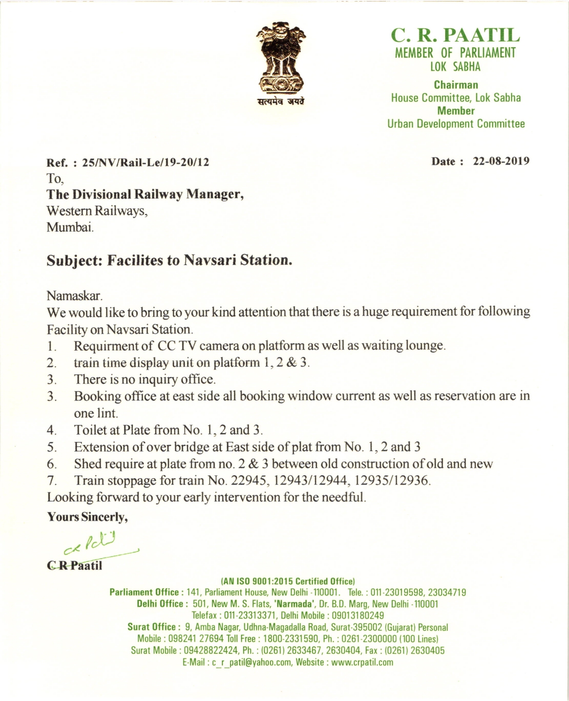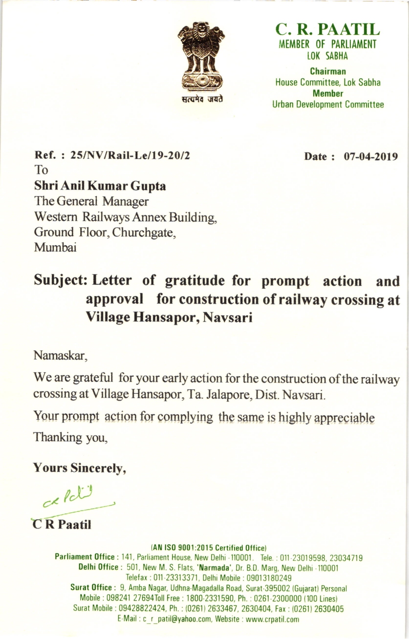 Letter of gratitude for prompt action and approval for construction of railway crossing at Village Hansapor, Navsari